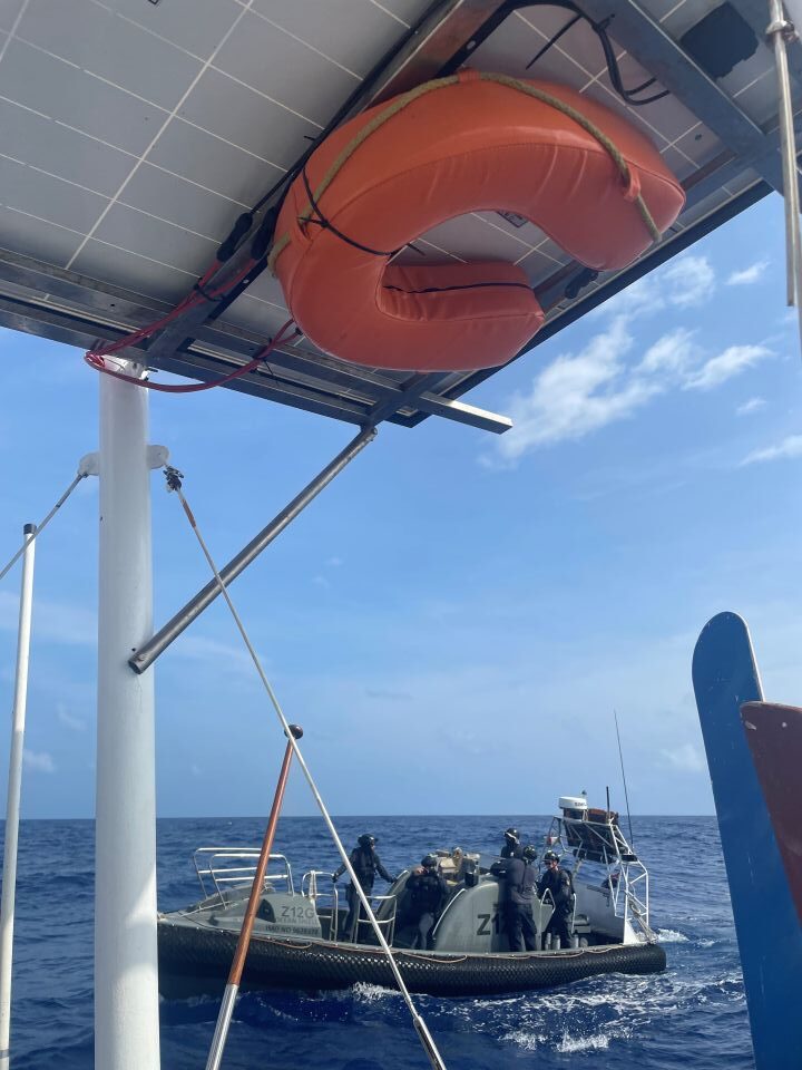 Spremljali so me že kar nekaj časa, kot se je malo kasneje izkazalo. Zaradi nizke amperaže baterij nisem imel prižgane VHF postaje, zato me niso mogli kontaktirati. Ker sem menda predstavljal potencialno nevarnost, so se odločili v vodo spustiti čoln s specialno posadko in se mi približati na nekaj metrov.