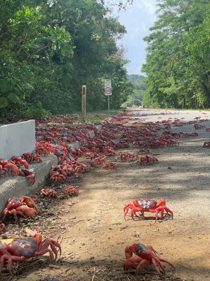 Žal mi je bilo, da sem invazijo rdečih rakov lahko opazoval le od daleč. Maria se jim je na kopnem morala izogibati, saj so raki nekakšna ikona otoka in imajo povsod prednost. Celo posebne mostovže so jim postavili čez ceste, vendar raki pri svoji letni selitvi v morje lezejo vsepovsod in otoške ceste spremenijo v rdeče preproge. Sredi vasi je zato velika tabla, na kateri so označene prepovedi prometa po ulicah, po katerih potujejo raki.